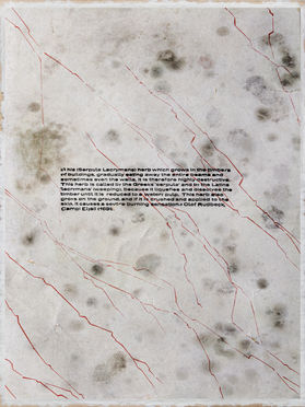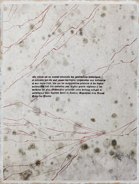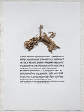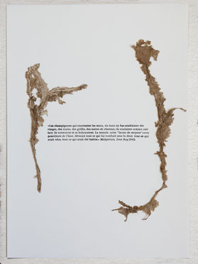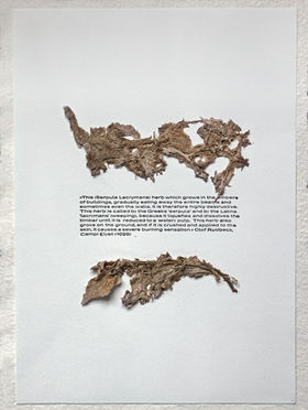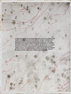 The series features printed text created using a traditional printing press on paper. The texts were selected from ancient manuscripts that delve into the historical accounts of fungal infections, early scientific publications that discuss mérule, specifically detailing the destructive impact of it on buildings and even human well-being, a passage extracted from the Bible, which serves as a warning about mérule and suggests rituals for purifying fungal infestations and writings that use Serpula Lacrymans as a metaphor to represent the decay and deterioration of both society and culture.