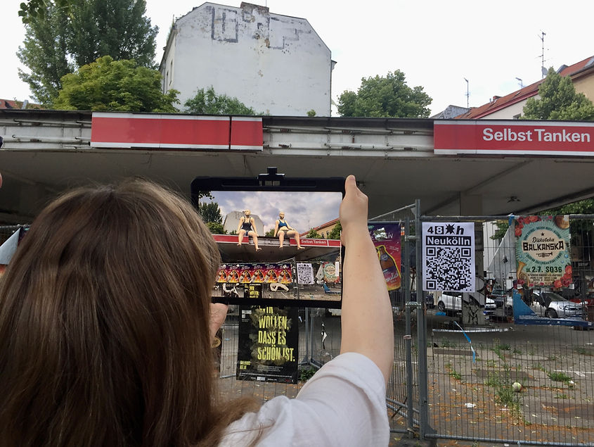 The Augmented reality experience features two digital figures sitting on an abandoned gas station in the Hermannplatz region. With the technical help of Florian Weinrich from DARV Workshop, 3D characters localized to the exact location and orientation in the context of the real world using AR Core geo-spatial localization technique. In this way, users were able to see the content just by pointing to their cameras.