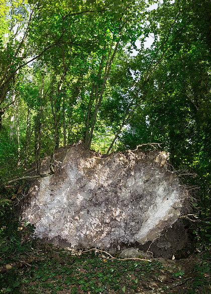 As part of an extensive exploration into the natural interplay and coexistence of organisms within a human-constructed habitats, the series centers around the natural areas in close proximity to the restoration site of La Chartreuse de Neuville. It primarily delves into the main material of the site, chalkstone, while also highlighting the surrounding soils and addressing the emergence and continuous mitigation of dry rot (La Mérule Pleureuse) within the building. The series comprises a collection of 8 photographs capturing fallen trees and an installation featuring 3D-scanned roots.